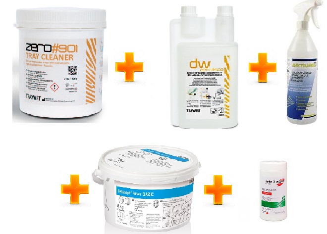 per portaimpronte (DW zero 901 trayart) barattolo 907g + per aspirazione (DW zero 500) flacone da un litro + per superfici (bactilemon soft 200) 6 litri + per la vaschetta (sekusept pulver) barattolo 2 kg + salviette (zeta 3) barattolo 120 pz